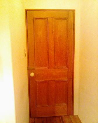 壁は漆喰、ドアは温かみのある木製。洗面台は、白いタイル貼り。